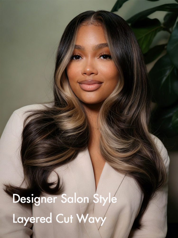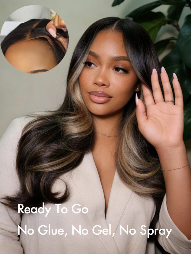 Face Framing Glueless 7x5 HD Lace Wig Highlights On Layered Wavy Human Hair