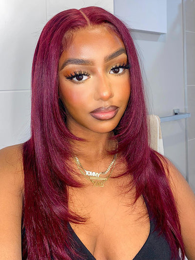 #99J Burgundy Layered Cut Straight 4x4 Lace Closure Wig 180% Density Flash Sale